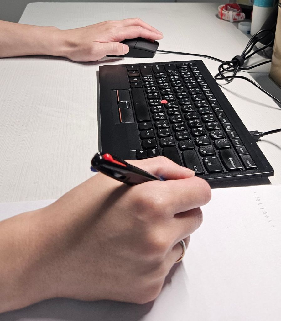 也習慣左手滑鼠、右手持筆(敲鍵盤),